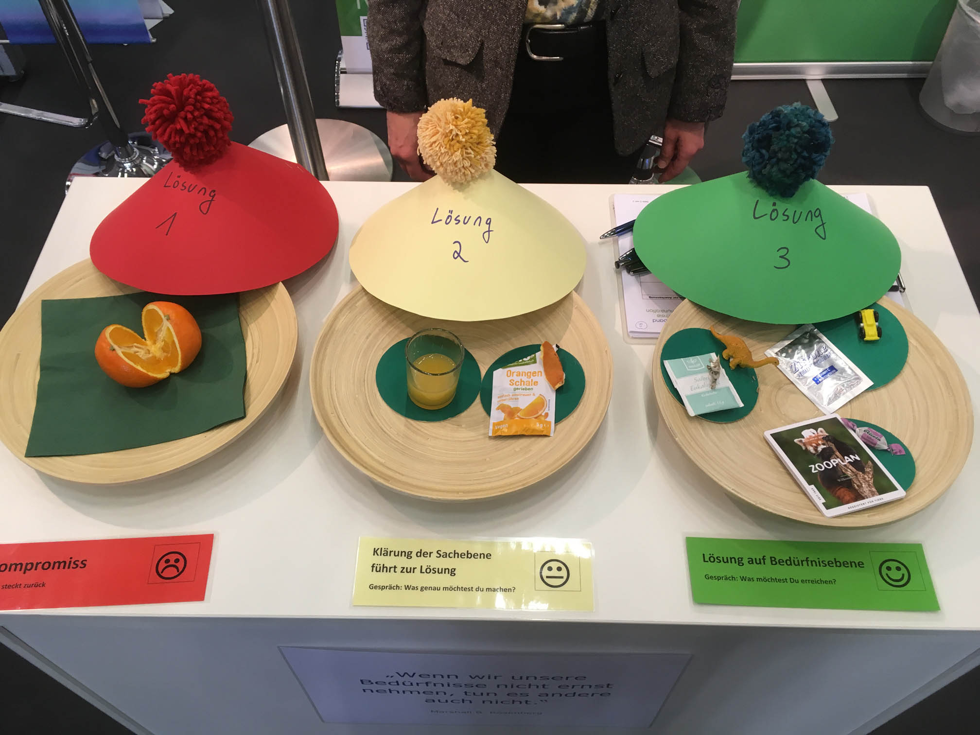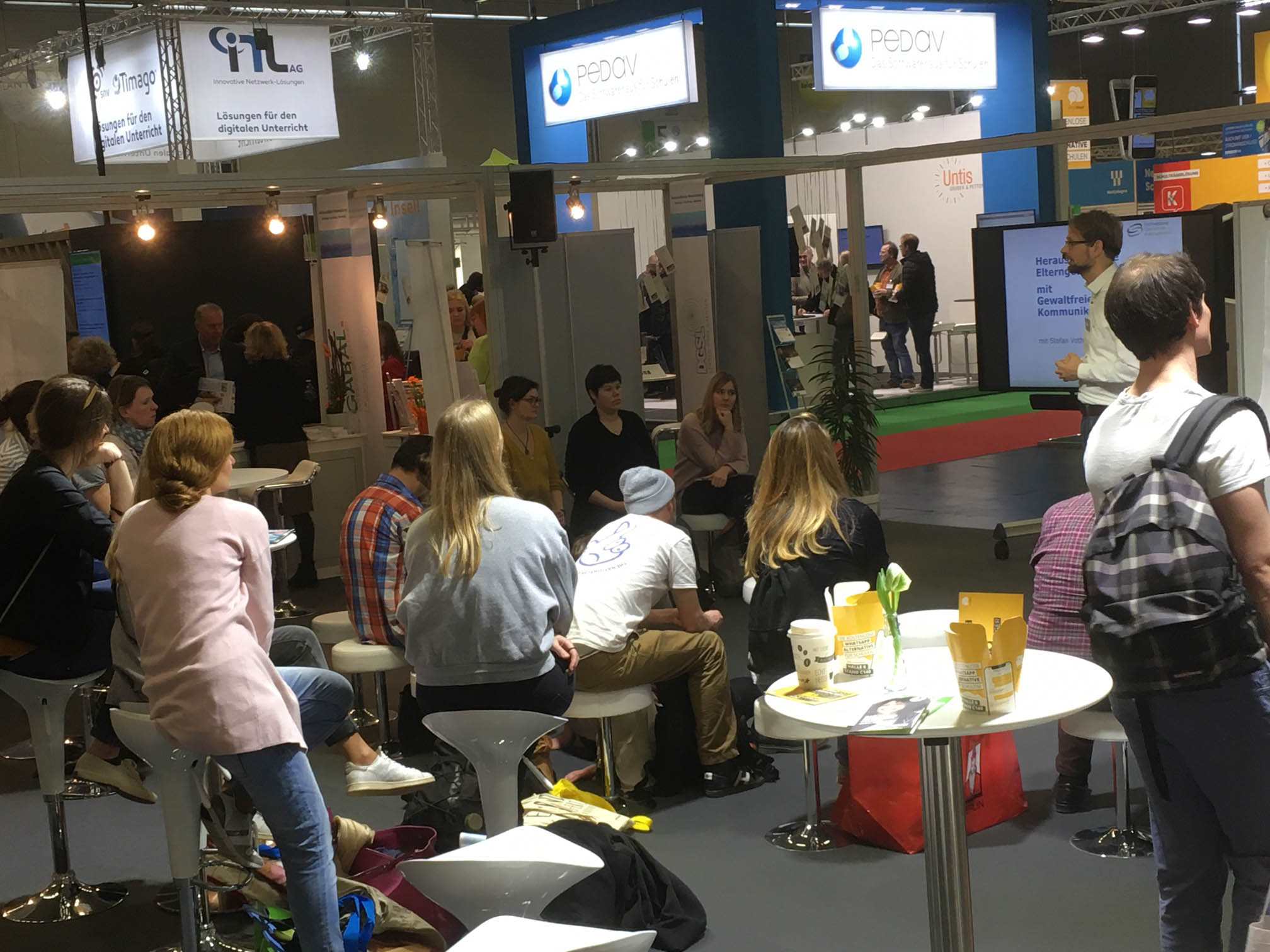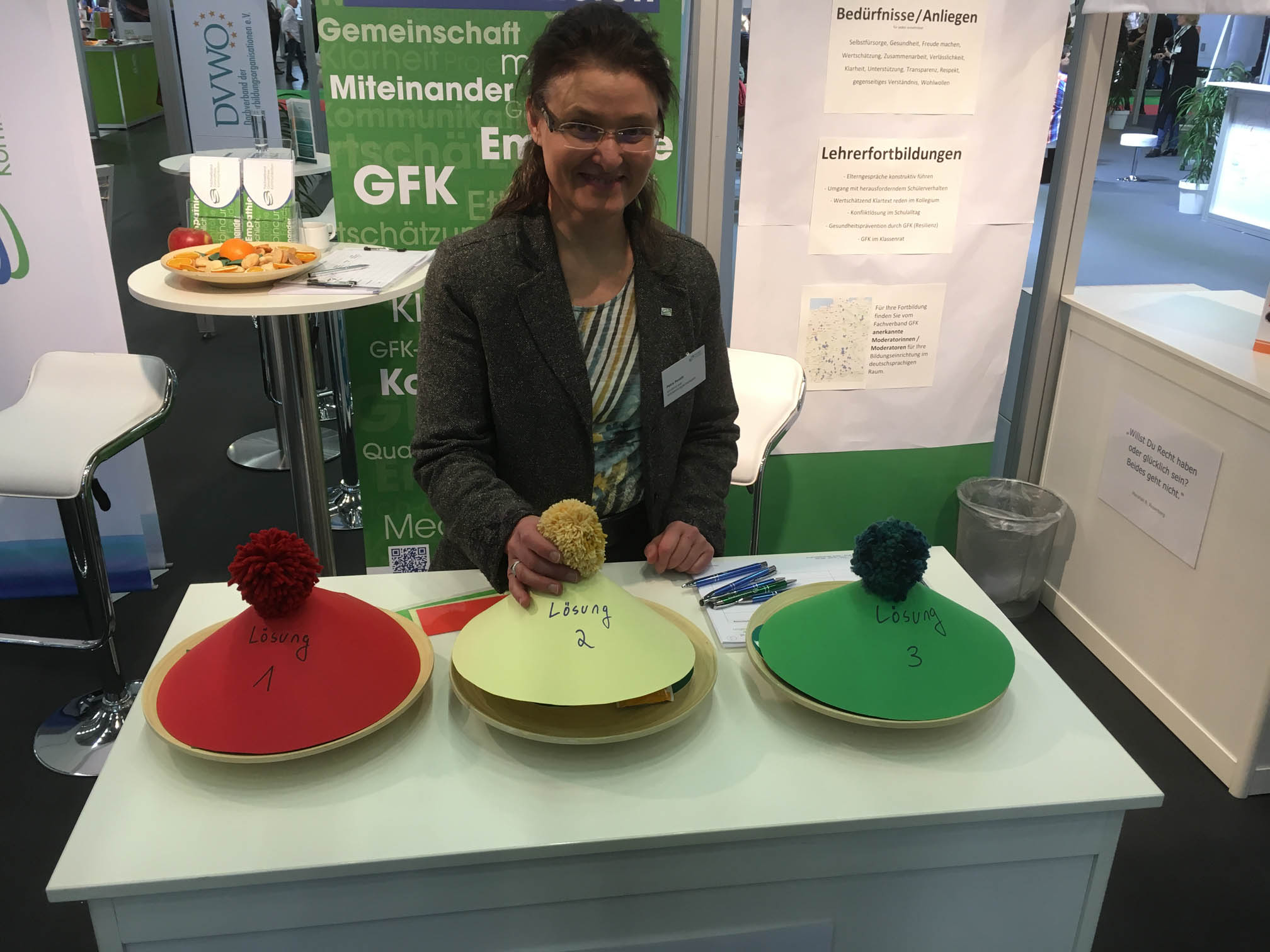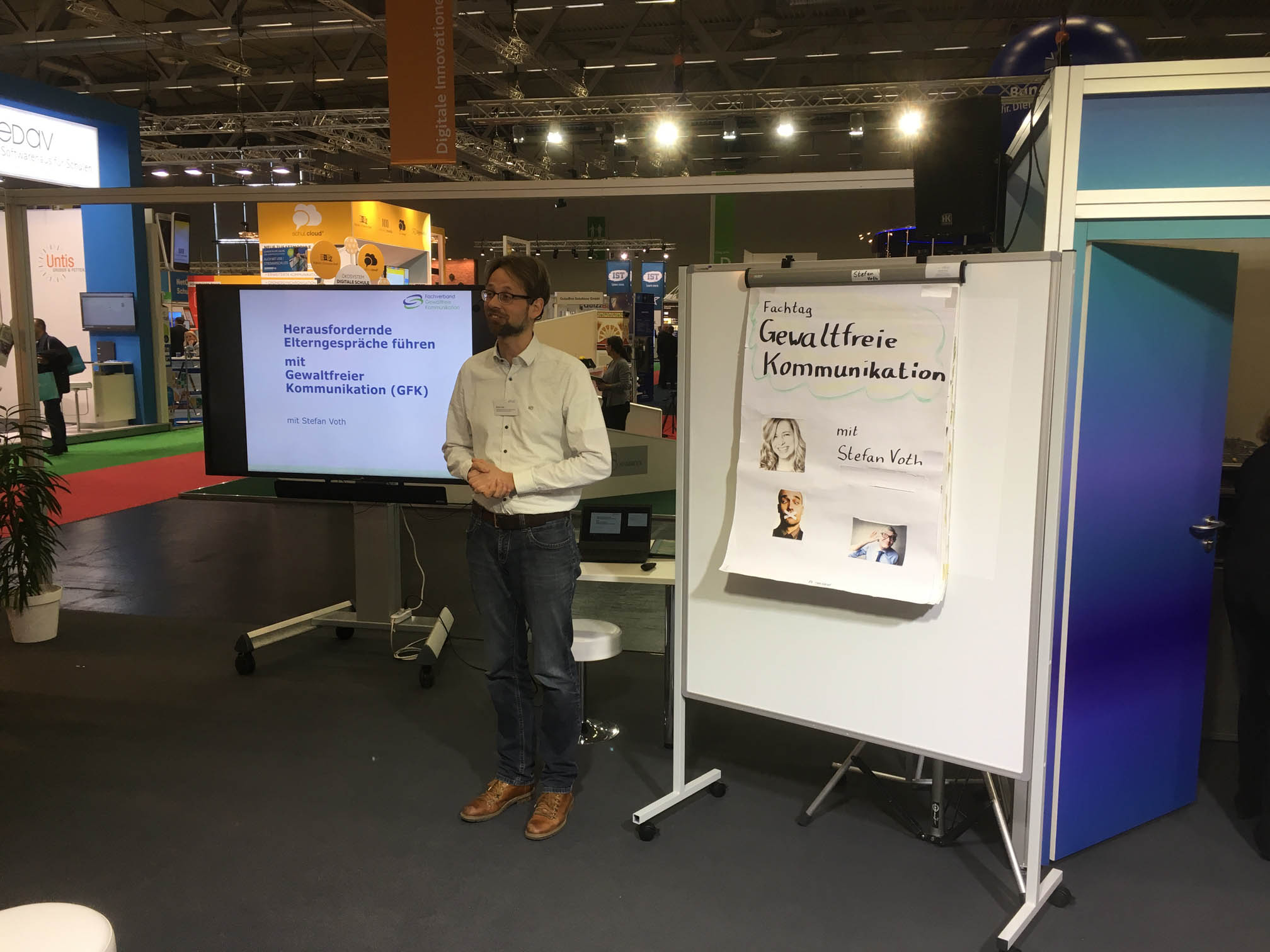 Bereits am ersten Tag der Bildungsmesse gab es reges Interesse an der Arbeit des Fachverband Gewaltfreie Kommunikation e. V. und nach GFK-Angeboten zu Training und Qualifizierung, berichtete Andi Schmidbauer am Abend. Petra Porath, Stefan Voth und Andi Schmidbauer führten gleich zum Auftakt der Didacta teils sehr intensive Gespräche mit über 100 InteressentInnen aus dem Bereich Erziehung und Regierungsorganisationen. Am Stand des Fachverbandes gab es außerdem Live-Demonstrationen zur Konfliktlösung, die am Beispiel einer Orange demonstriert wurden. Im weiteren Tagesverlauf präsentierte Stefan Voth seinen Workshop „Herausfordernde Elterngespräche führen mit GFK“, der ebenfalls auf großes Interesse stieß.